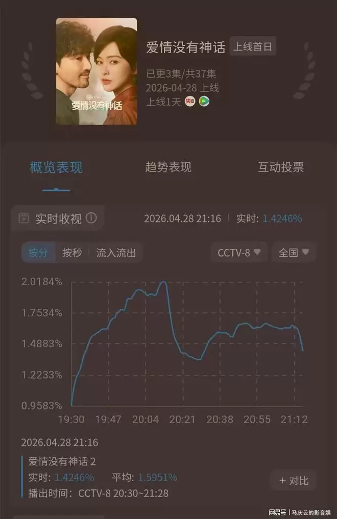 收视数据很快给出了市场的初步反应。根据酷云实时数据显示,该剧首集峰值收视率未能突破2%,甚至不及此前口碑欠佳的《八千里路云和月》。更值得注意的是,第二集的实时收视率较之首集出现了明显下滑。这通常是一个清晰的信号:首集内容未能留住观众,导致大量观众在开局后便选择了弃剧。照此趋势,这部剧很可能创下近期同类剧集的收视新低。