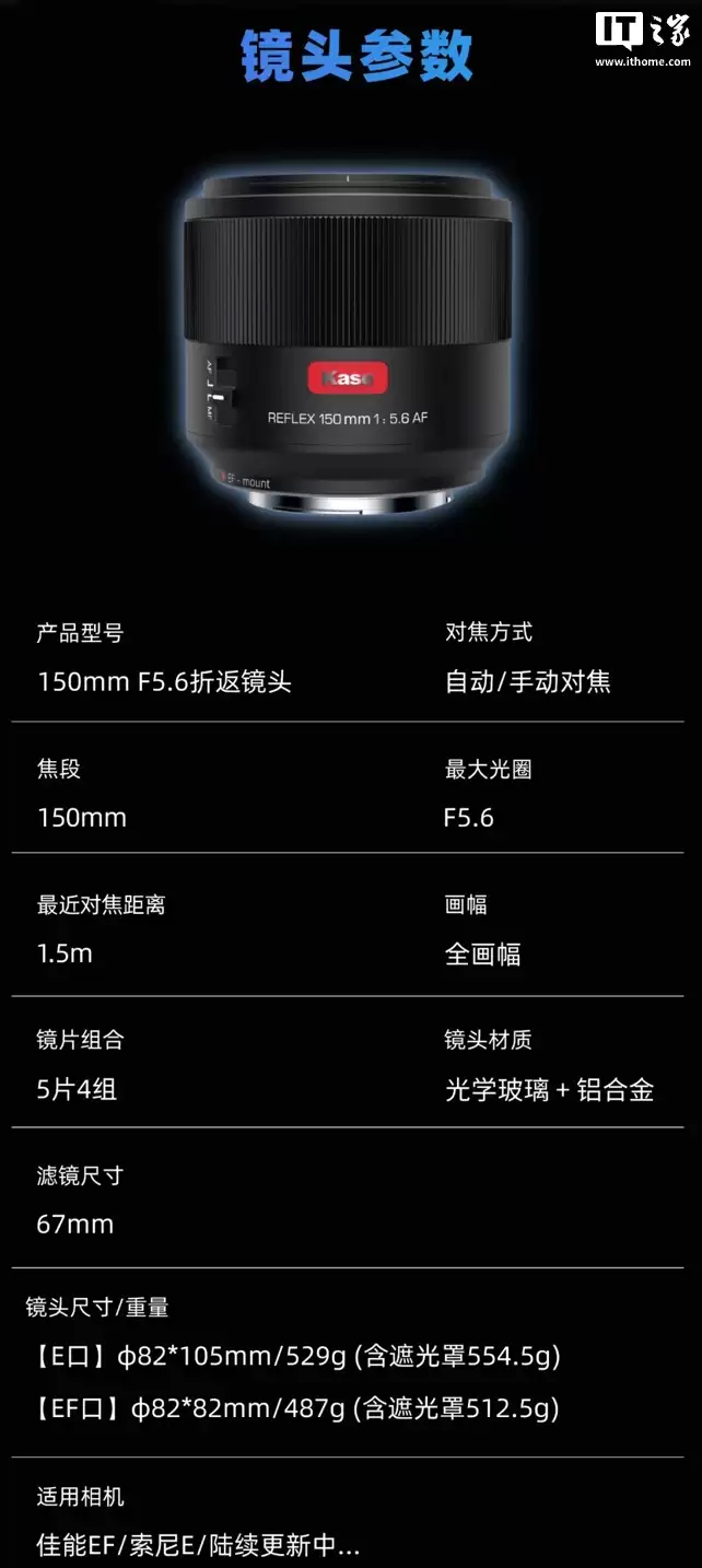 卡色 150mm f/5.6 全画幅自动对焦折返镜头发布:3850 元,适配佳能 EF / 索尼 E 卡口