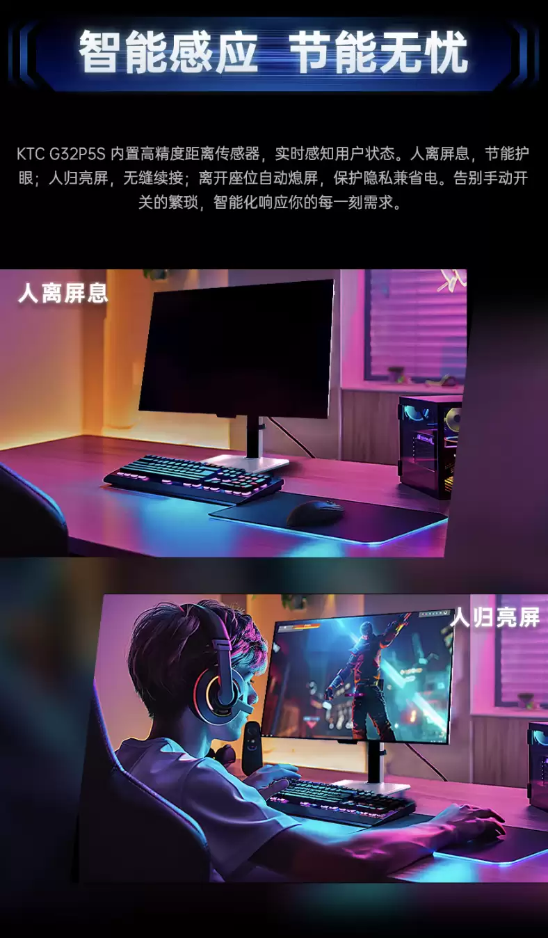 面板规格上,KTC G32P5S采用了LG OLED面板,具备1500000:1的极致对比度与0.03ms GTG灰阶响应时间,从根本上消除了画面拖影。针对OLED潜在的图像残留问题,它集成了像素位移、亮度补偿等多重防护算法。护眼方面,硬件级低蓝光技术与VESA DisplayHDR 400 True Black认证协同工作,在呈现深邃黑场的同时保障视觉舒适度。Adaptive-Sync同步技术则确保了游戏画面无撕裂、无卡顿。
