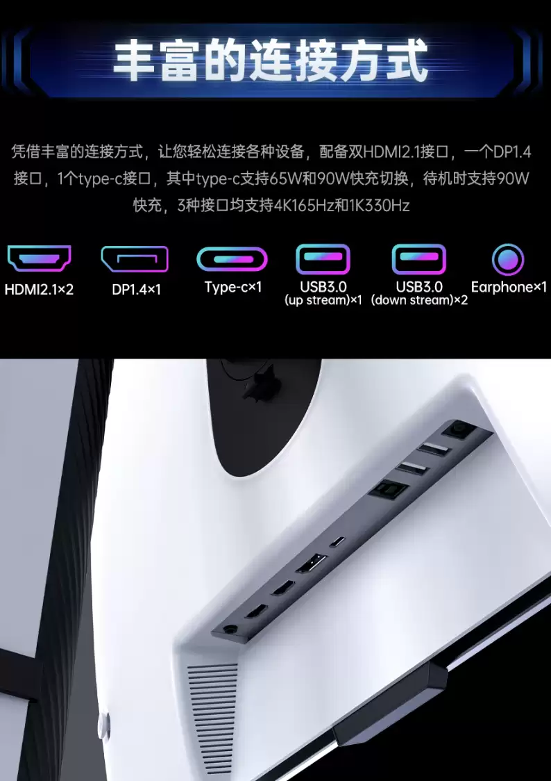 外围配置体现了对用户体验的深度考量。环境光感应器可依据环境照度自动调节屏幕亮度。接口阵容全面:配备双HDMI 2.1、单DP 1.4、一个支持65W/90W反向供电的Type-C接口,以及一个上行USB-B和两个下行USB-A 3.0接口,轻松构建高效工作站。人体工学支架支持高度、倾斜、旋转及横竖屏调节,满足长时间使用的健康坐姿需求。
