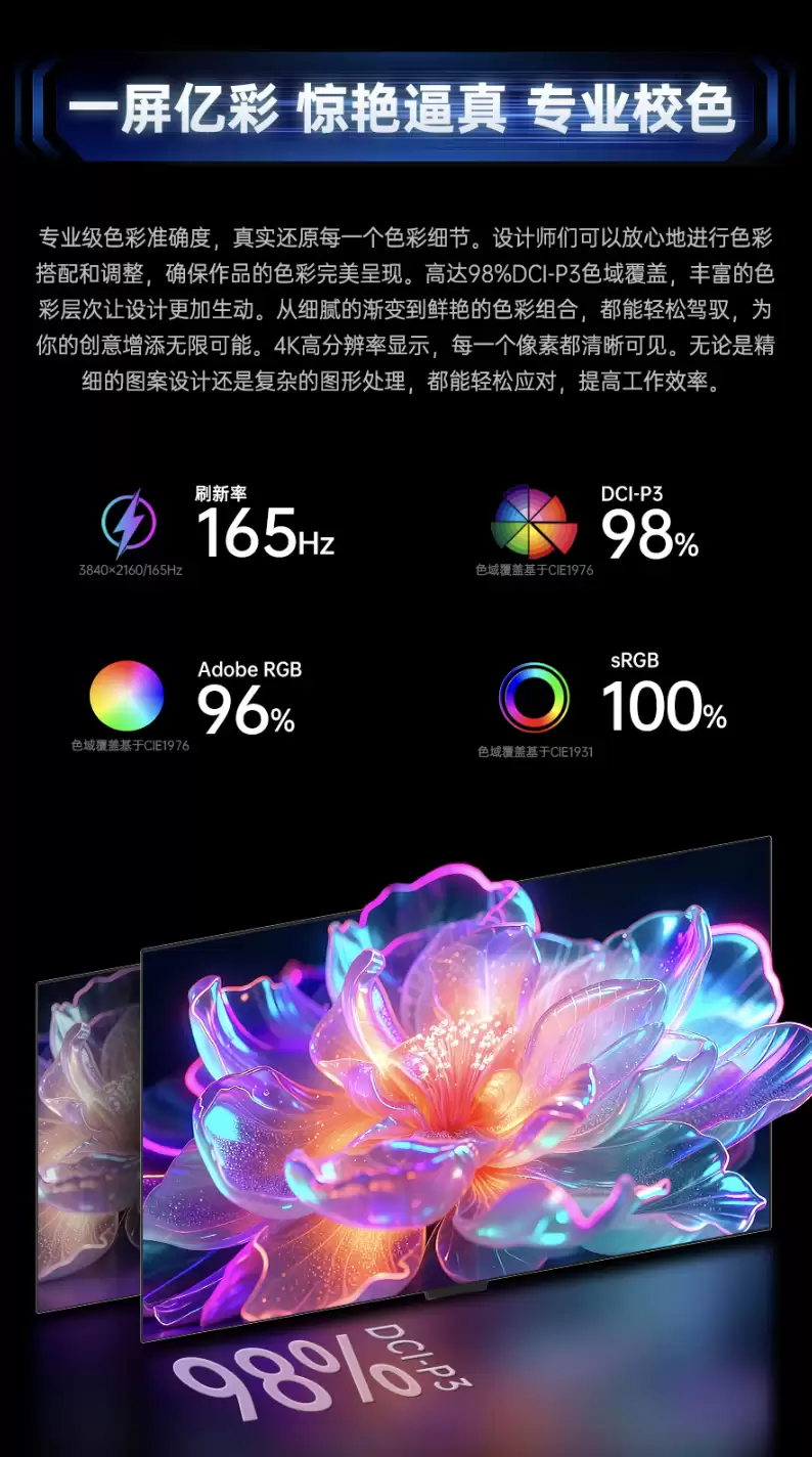 其核心优势在于场景自适应的双模显示技术。通过专用热键,用户可在4K 165Hz的高清创作/3A游戏模式,与1080P 330Hz的极限电竞模式间瞬时切换。这意味着一台设备既能驾驭《艾尔登法环》的宏大场景细节,也能满足《无畏契约》对帧率与响应速度的苛刻要求。色彩表现上,它覆盖了100% sRGB、98% DCI-P3及96% Adobe RGB色域,为内容创作与影音娱乐提供了专业级准度。内置的距离传感器实现了人走屏熄,兼顾了节能与OLED屏幕的寿命维护。