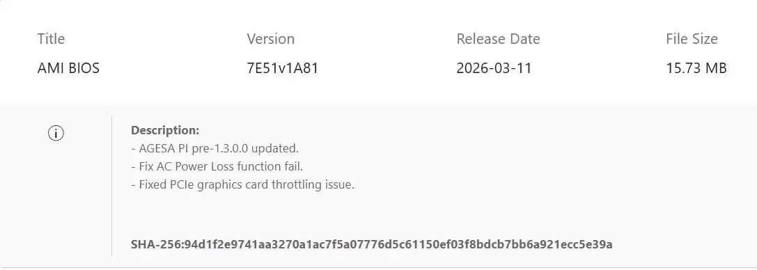 目前,修复已率先应用于微星MAG X870 Tomahawk WiFi主板,其BIOS版本7E51v1A81集成了AMD AGESA PI Pre-13.0.0微代码。此次更新重点改进了主板启动时的PCIe链路训练与稳定化逻辑,从固件层面杜绝了误判降速的发生。