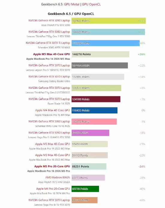 分开细看,OpenCL性能上,M5 Max依旧小幅压制RTX 5070移动版。而M5 Pro这边,则被英伟达全新的Blackwell系列移动显卡全面压制,仅仅略优于AMD的Radeon 8060S。