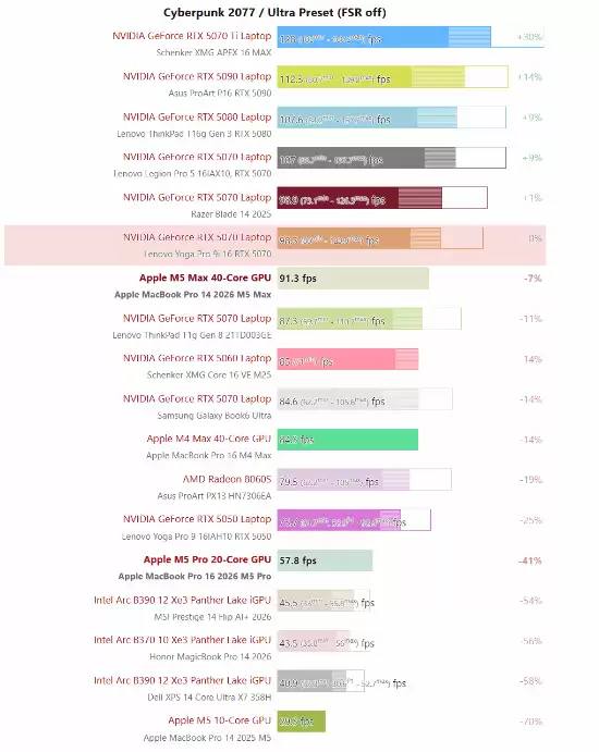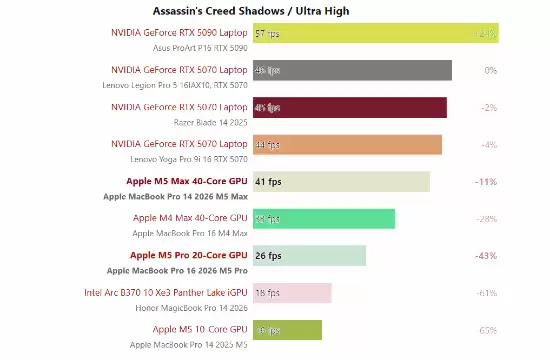 M5 Pro的游戏表现则略显挣扎。虽然在基准测试中曾领先于AMD的Radeon 8060S,但一到实际游戏场景,就被这款实力超群的集成显卡反超了。同时,它也落后于英伟达Blackwell系列的全线移动显卡。