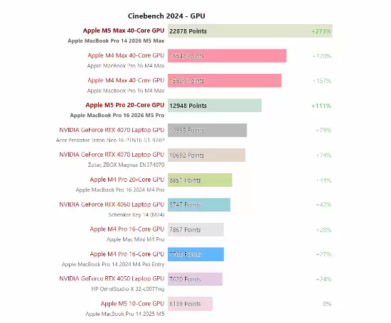 相比之下,20核的M5 Pro GPU在这项测试里比老大哥慢了41%,其性能定位刚好卡在RTX 5050和RTX 5060移动版之间。有意思的是,它还能领先AMD Strix Halo平台上的强力选手Radeon 8060S约15%。