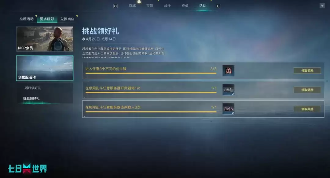 其中,进入极限乱斗服、击杀敌人、开启武器箱均为本期专属挑战任务——来极限乱斗服畅玩,任务和奖励可以一并带走。