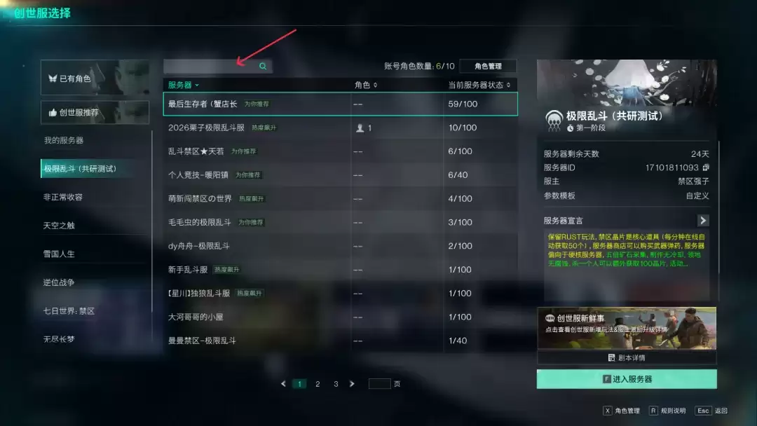 根据上面的时间表,玩家只需在活动时间段内进入指定的服务器即可直接参与。服务器会在每轮活动开始前3分钟解锁,参与名额先到先得,手慢无。你可以在游戏内的搜索栏中输入对应的服务器ID,快速找到活动服务器。