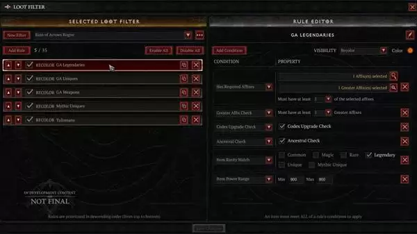 过滤器功能可以帮助你自动隐藏不需要的物品。你可以自定义筛选条件,例如只显示带有特定词缀或达到特定品质的装备和物品。似乎还能用不同颜色来高亮标记各类物品,非常直观。