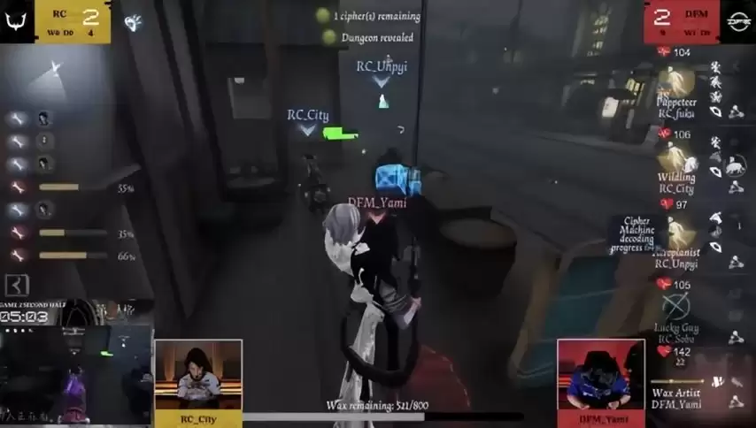 回顾比赛细节,DFM_Yami的发挥堪称教科书级别的稳定。BO2下半场,他选出蜡像师。开局节奏极快,迅速击倒幸运儿并将其送入地下室,由于求生者方选择放弃救援,幸运儿被率先淘汰。比赛进入中期,蜡像师又将飞行家击倒上椅,虽经木偶师扛伤救下,但战局主动权已然在握。随后,DFM_Yami做出了一个关键决策:围绕最后一台密码机与求生者展开精密拉扯。正是这种压迫性的控场,使他再次击倒飞行家并送上狂欢之椅。尽管密码机最终被求生者破译完毕,进入开门战,但蜡像师依然精准击倒野人并将其送椅,稳稳完成三抓,为队伍积累了巨大的优势。