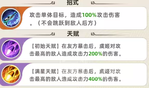 真正的核心在于她的爆发逻辑——完全依赖于队友的暴击。当任意友方单位触发暴击后,虞姬会立刻对敌方当前攻击力最高的目标发动一次强化打击。初始天赋下,这次打击能造成200%攻击力的额外伤害;而一旦达到满星状态,这个数值会飙升到400%,相当于三倍于基础攻击的恐怖输出。
