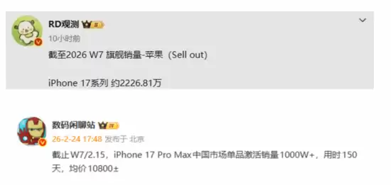 而更让我觉得有意思的是机型分布。这次挑大梁的,毫无悬念是机皇——iPhone 17 Pro Max。截至同一时间,光是这一款高端机型,在中国市场的激活量就已经突破了1000万台大关。一款定价过万的手机,单品销量破千万,这放在整个行业历史里看,都是个相当震撼的成绩。