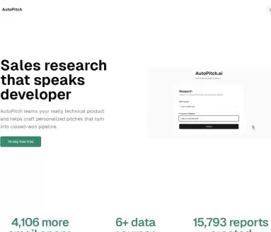 在技术产品的销售战场上,时间总是不够用,而了解潜在客户的深度往往决定着成败。那么,有没有一款工具能像一位不知疲倦的销售工程师,帮你快速、深入地剖析客户呢?AutoPitch.ai的出现,正是为了回答这个问题。由Creative AI公司开发的这款AI销售研究工具,专门为销售技术型产品而打造。它的核心逻辑很清晰:通过人工智能进行深度分析,主动学习产品的各项特征与技术细节,从而帮助用户自动化地创作出针对性极强的个性化销售邮件。