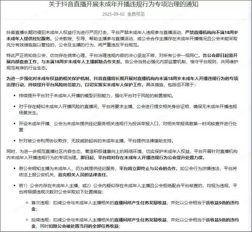 一个标志性的事件发生在9月10日,抖音直播一纸公告,直接清退了11家涉及“未成年开播违规行为”的公会。这仅仅是冰山一角。统计数据显示,仅下半年,各大直播平台清退的违规公会数量就十分惊人,抖音一家就近200家。快手、视频号等平台同样没有手软,例如快手在8月的一次整治中,就处置了295家公会,其中22家被直接清退。