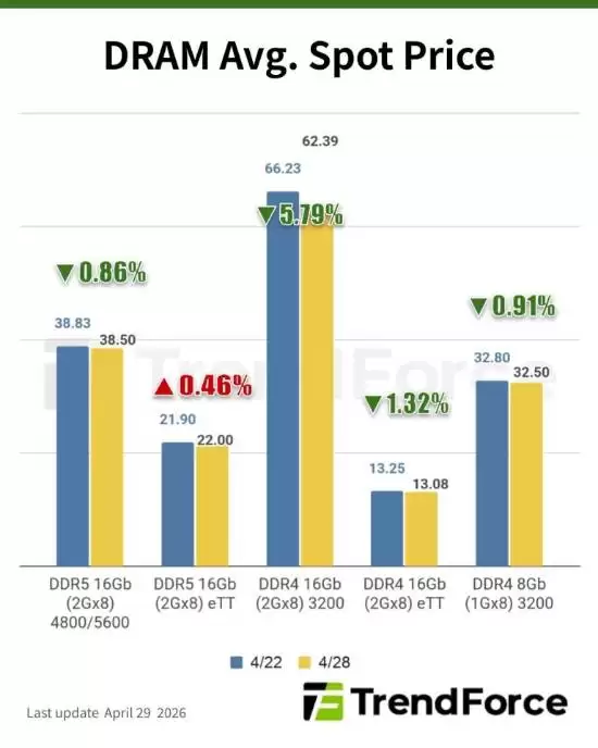 在这种背景下,整体现货价格延续了下行趋势。以主流芯片DDR4 1Gx8 3200MT/s为例,其平均现货价从上周(4月22日)的32.80美元,微降至本周(4月28日)的32.50美元,周跌幅为0.91%。