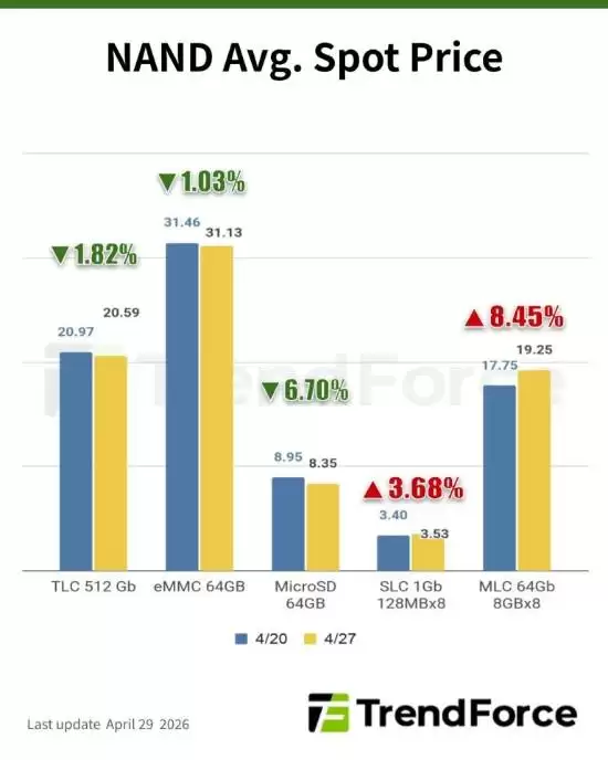 根据TrendForce最新的现货行情报告,存储市场整体氛围依然保守。DRAM领域,仅有DDR5芯片还能维持零星的交易热度,而DDR4的需求则持续低迷。另一边,NAND Flash的现货价格在过去一个月里经历了显著调整,累计跌幅达到了30%至40%。