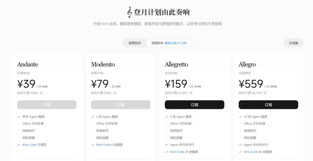 不同于豆包、DeepSeek等免费工具,Kimi是一款付费产品。它设置了多档会员体系:免费版、每月39元的Andante版、每月79元的Moderato版,甚至还有每月159元的Allegretto版。