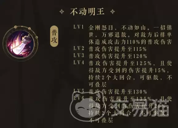 叶鼎之的定位非常清晰:一位专精于后排单体爆发的输出手。他的普攻技能“不动明王”能够直接锁定敌方后排任意目标,造成相当于自身110%攻击力的伤害。这仅仅是起点。随着技能等级提升,这个看似简单的技能会逐渐显露出战略价值:升至3级,伤害提升至120%;而到了4级,伤害进一步增至125%的同时,还会为目标附加一个持续两回合、不可驱散且无法叠加的15%易伤效果。