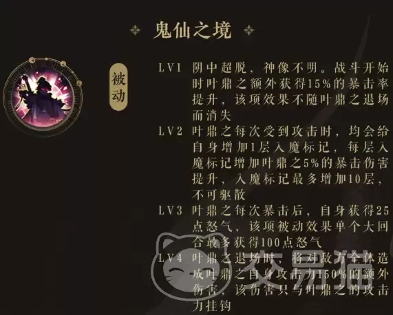 一个顶级输出角色,除了进攻手段,还需要稳定的成长体系来支撑其上限。叶鼎之的被动技能“鬼仙之境”正是为此而生。战斗伊始,他便直接获得15%的暴击率加成,且该效果不会因退场而消失,提供了稳定的输出基础。